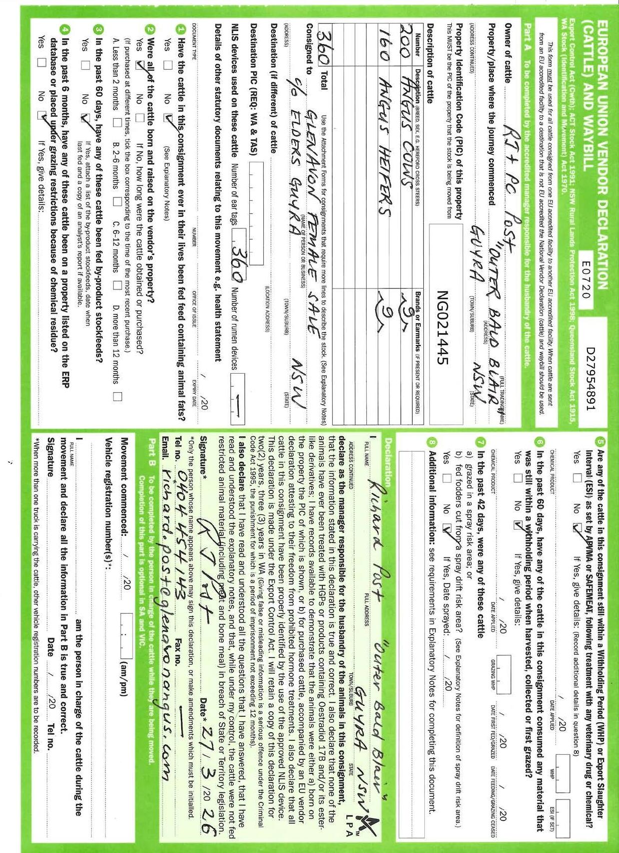 This is to certify that on the 03/01/2026 at the request of Mr. & Mrs. R. & P. Post, Glenavon Angus, Guyra , NSW, I pregnancy tested and determined foetal gender (aided by ultrasound technology) the cattle identified below and confirmed them to be pregnant