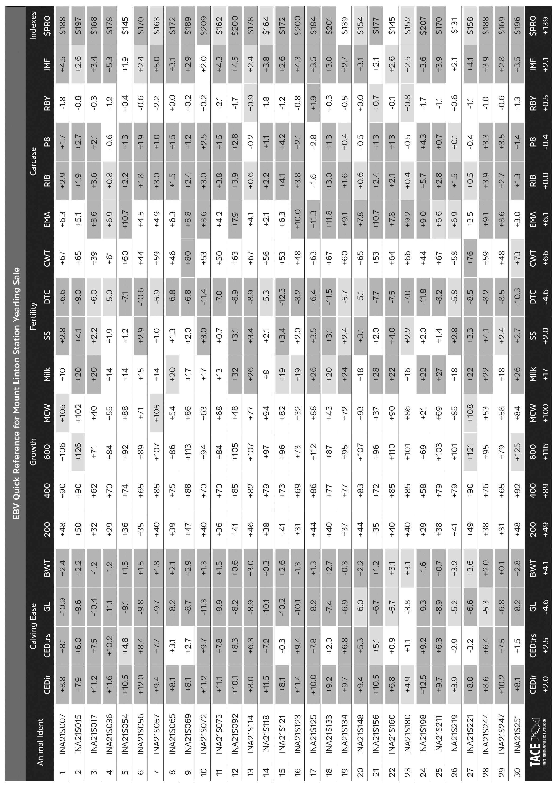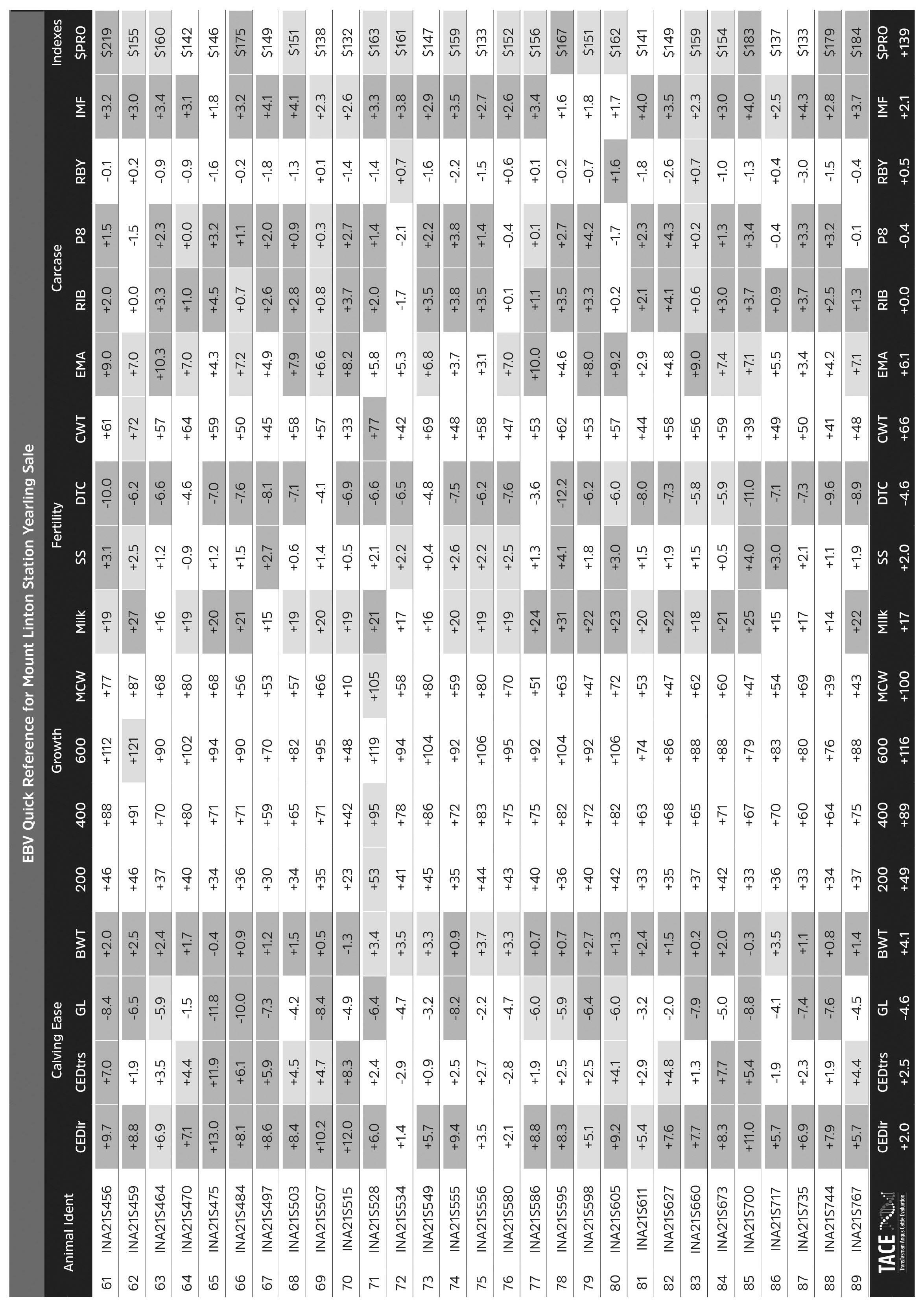 2022 TransTasman Angus Cattle Evaluation CEDir CEDtrs GL BW 200 400 600 MCW Milk SS DTC CWT EMA Rib P8 RBY IMF EBVs +7.3 +7.5 -5.8 +1.9 +48 +85 +112 +86 +23 +1.2 -5.9 +59 +3.6 +3.3 +2.8 -2.3 +3.6 Acc 58% 50% 73% 73% 72% 72% 72% 70% 66% 67% 43% 66% 65% 69% 66% 66% 64% Perc 13 8 30 10 57 63 60 74 9 80 27 76 85 2 3 99 7 MOUNT LINTON S440SVLot 58 INA21S440 Date of Birth: 14/09/2021 AMF,CAF,DDF,NHFRegister: APR Mating Type: AI SIRE: NORM785 RENNYLEA M785PV DAM: NZE20305114226 LINTON 14226# RENNYLEA G317PV RENNYLEA D633SV LAWSONS HENRY VIII D1054PV LINTON 09704# Traits Observed: BWT,200WT,400WT,Scan(EMA,Rib,Rump,IMF),Genomics Purchaser................................................................................................................................................................................................. $........................................................................................ Selection Index $PRO $165 25 October 2022 TransTasman Angus Cattle Evaluation CEDir CEDtrs GL BW 200 400 600 MCW Milk SS DTC CWT EMA Rib P8 RBY IMF EBVs +8.8 +3.7 -3.4 +3.0 +37 +74 +91 +64 +18 +1.5 -8.8 +61 +5.4 +2.1 +1.0 -1.1 +3.6 Acc 53% 46% 69% 73% 71% 71% 72% 69% 62% 61% 38% 64% 63% 68% 65% 64% 62% Perc 6 42 70 25 94 88 92 95 46 70 3 68 59 7 18 94 7 MOUNT LINTON S449SVLot 59 INA21S449 Date of Birth: 11/09/2021 AMF,CAF,DDC,NHFRegister: APR Mating Type: Natural SIRE: NZE20305018214 LINTON 18214# DAM: NZE20305117448 LINTON 17448# RENNYLEA G420SV LINTON 16081# LINTON 15222# LINTON 13420# Traits Observed: BWT,400WT,Scan(EMA,Rib,Rump,IMF),Genomics Purchaser................................................................................................................................................................................................. $........................................................................................ Selection Index $PRO $165 25 October 2022 TransTasman Angus Cattle Evaluation CEDir CEDtrs GL BW 200 400 600 MCW Milk SS DTC CWT EMA Rib P8 RBY IMF EBVs +3.9 +2.7 -8.2 +1.5 +36 +69 +82 +45 +16 +2.8 -6.4 +47 +8.6 -0.9 -0.3 +1.2 +3.6 Acc 54% 49% 69% 72% 70% 69% 70% 69% 63% 63% 39% 66% 63% 69% 65% 66% 63% Perc 39 52 8 7 96 95 97 99 61 20 20 96 16 75 47 22 7 MOUNT