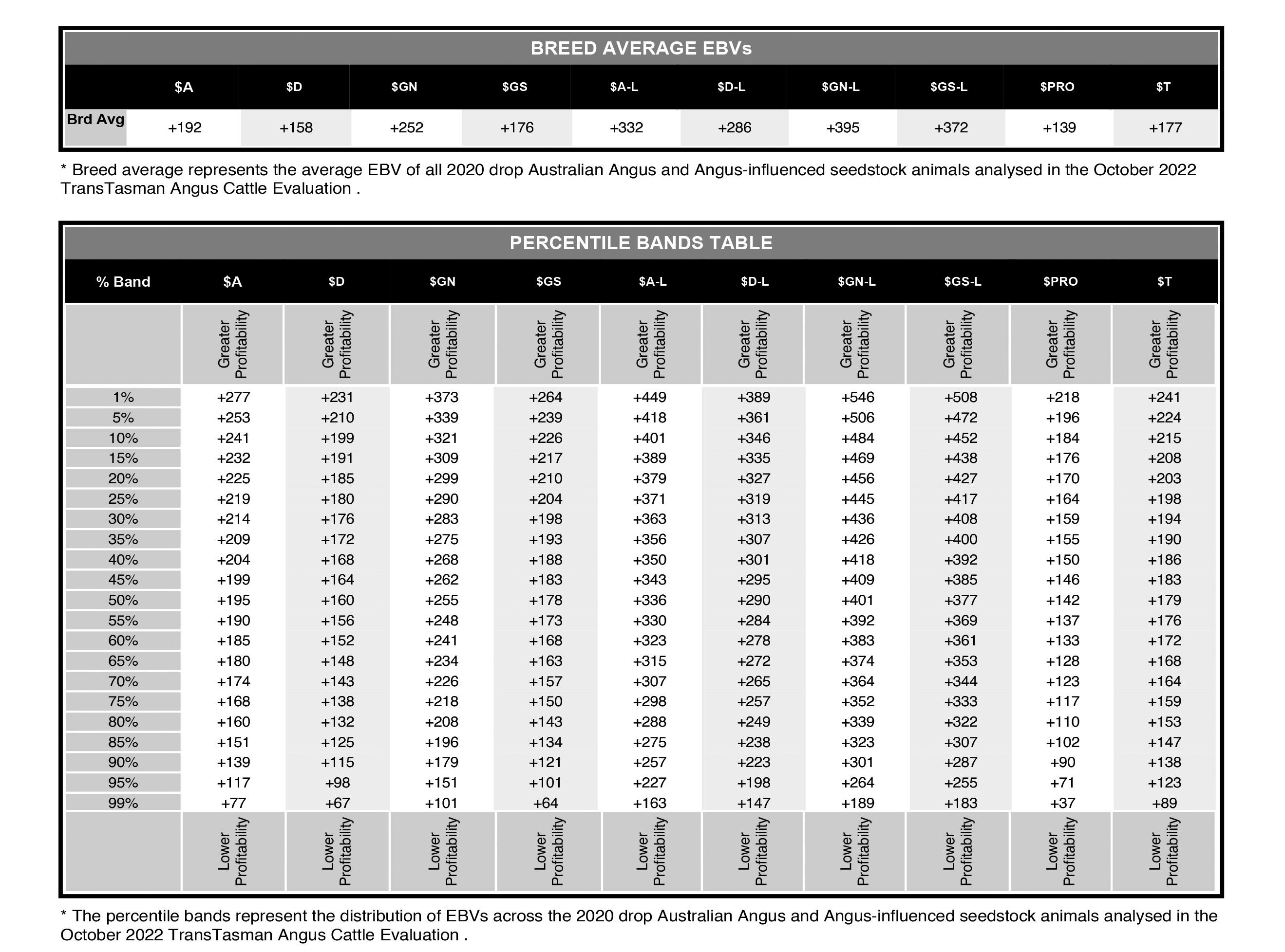 2022 TransTasman Angus Cattle Evaluation CEDir CEDtrs GL BW 200 400 600 MCW Milk SS DTC CWT EMA Rib P8 RBY IMF EBVs +9.4 +2.5 -8.2 +0.9 +35 +72 +92 +59 +20 +2.6 -7.5 +48 +3.7 +3.8 +3.8 -2.2 +3.5 Acc 53% 48% 68% 69% 68% 68% 69% 68% 63% 62% 39% 65% 62% 68% 64% 65% 62% Perc 4 54 8 4 97 92 91 97 29 26 10 95 84 1 1 99 8