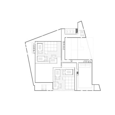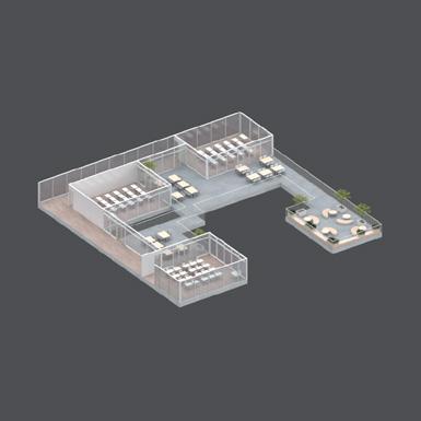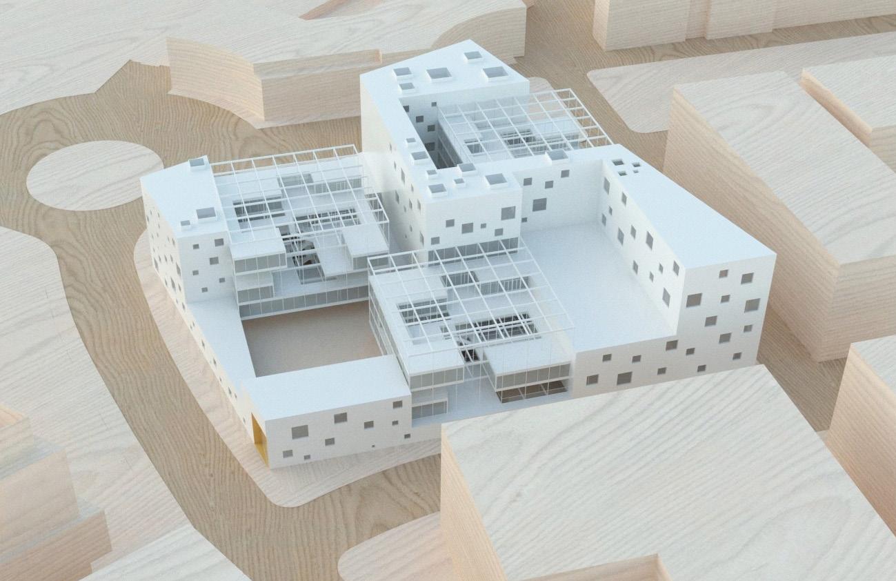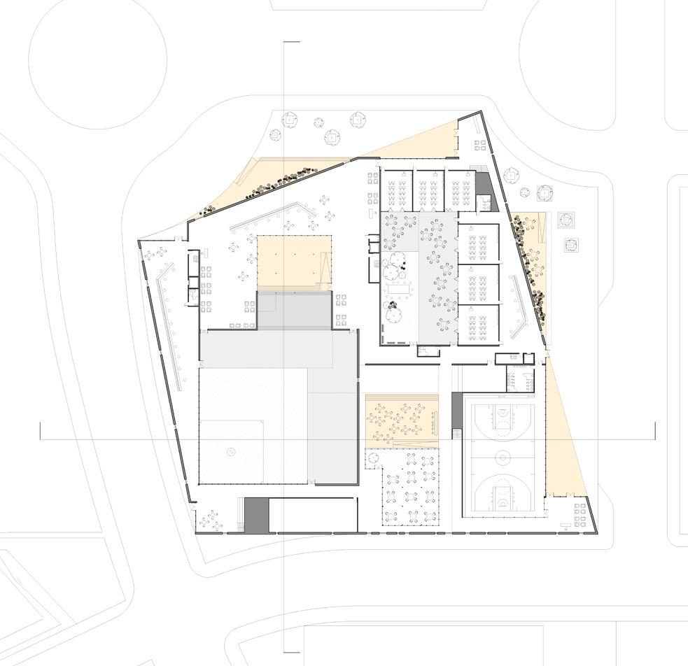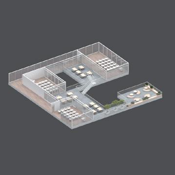 F. The structure also informs the spational partitioning of the programs such as the central void for social gathering and the rotating orientation of the classrooms around the central void.