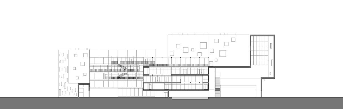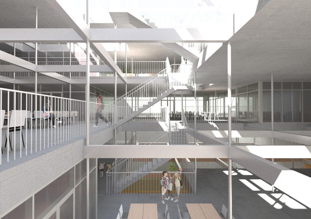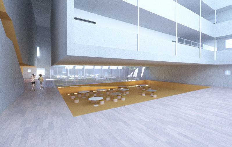 The vertical circulation elements create an environment of compression that enhances the open and porous experience of the classrooms.