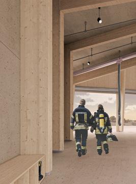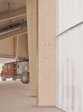 E. Wood posts and laminated beams are used to construct the main structure above ground, referencing traditional barn construction methods. The wood structure is left naturally finished to highlight the material used in barn construction.