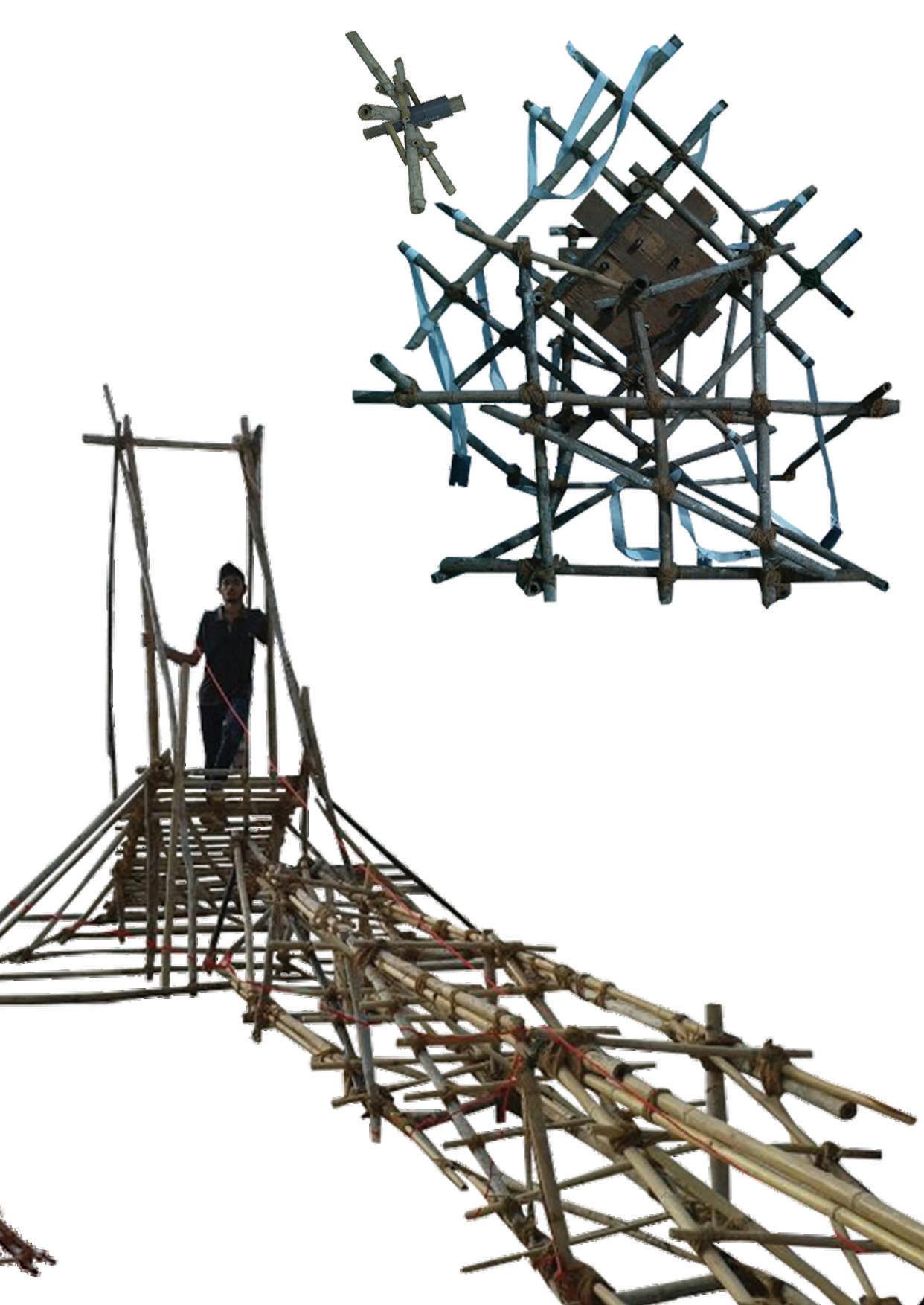 The cantilever had a step formation that allowed a person to climb on it. It was a 9m long cantilever. Since, the primary material bamboo being poor in tension, nylon strings were tied at both the ends allowing the cantilever to stay in its form. The structure’s triangular form allowed it to take upto 45kg of weight.