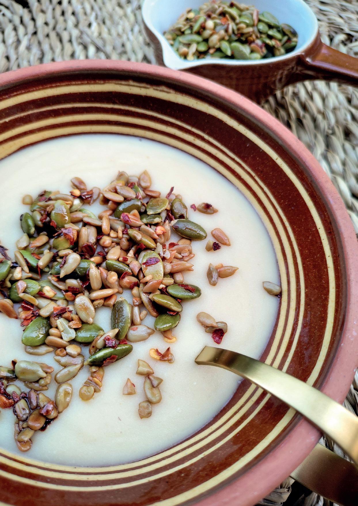 Ota keitinvesi talteen. Lisää perunoiden ja lanttujen joukkoon valutetut ja huuhdellut pavut sekä kasvikerma. Soseuta kasvikset sauvasekoittimella. Lorauttele samalla joukkoon keitinvettä, kunnes saat keitosta halutun paksuista. Mausta valkosipuli- ja sipulijauheella sekä lisää vielä tarvittaessa suolaa.