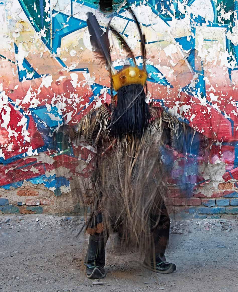 maines – accompagne les tambours et les grelots. À l’intérieur, son fils, âgé de six ans, court et saute sur le sol, entièrement absorbé par son jeu, indifférent au déroulement du rituel. Son insouciance tranche avec la présence du père, déjà revêtu de ses attributs cérémoniels: plumes, sonnailles et symboles ancestraux.