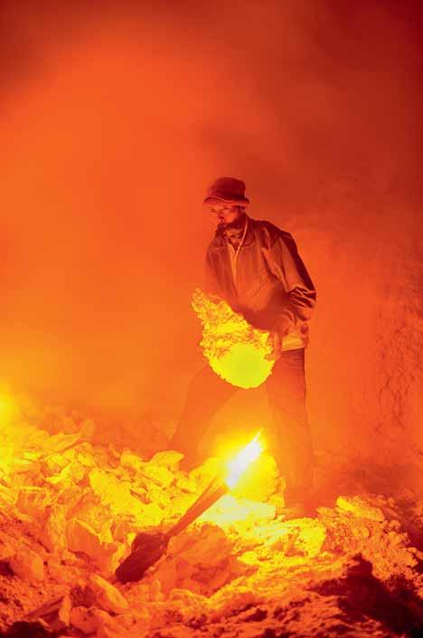 Du fameux lac vert du Kawah Ijen, une soupe de sel minéraux, d’acide chloridrique et de sulfates s’échappe des fumerolles de dioxyde de soufre à l’origine du solfatare situé sur sa rive nord. C’est là que les mineurs viennent extraire les plaques de ce minéral rutilant à la lueur des flambeaux.