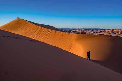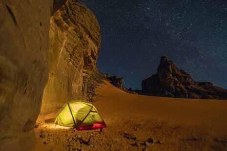 Progression de fourmis dans le dédale des dunes abricot de Tin Merzouga, où le voyage à pied prend parfois des allures de mirage solaire. Le soir, l’installation du bivouac dans un nid de sable au pied d’une paroi de grès patiné par des siècles de solitude venteuse, ne peut qu’inspirer un sentiment d’humilité.