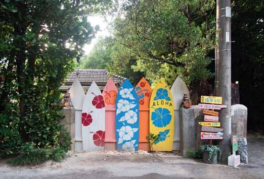 Au village de Bise, un portail en bois rappelle des planches de surf. Des touristes prennent un selfie sur la véranda du Kourijima Café, sur l’île de Kouri.