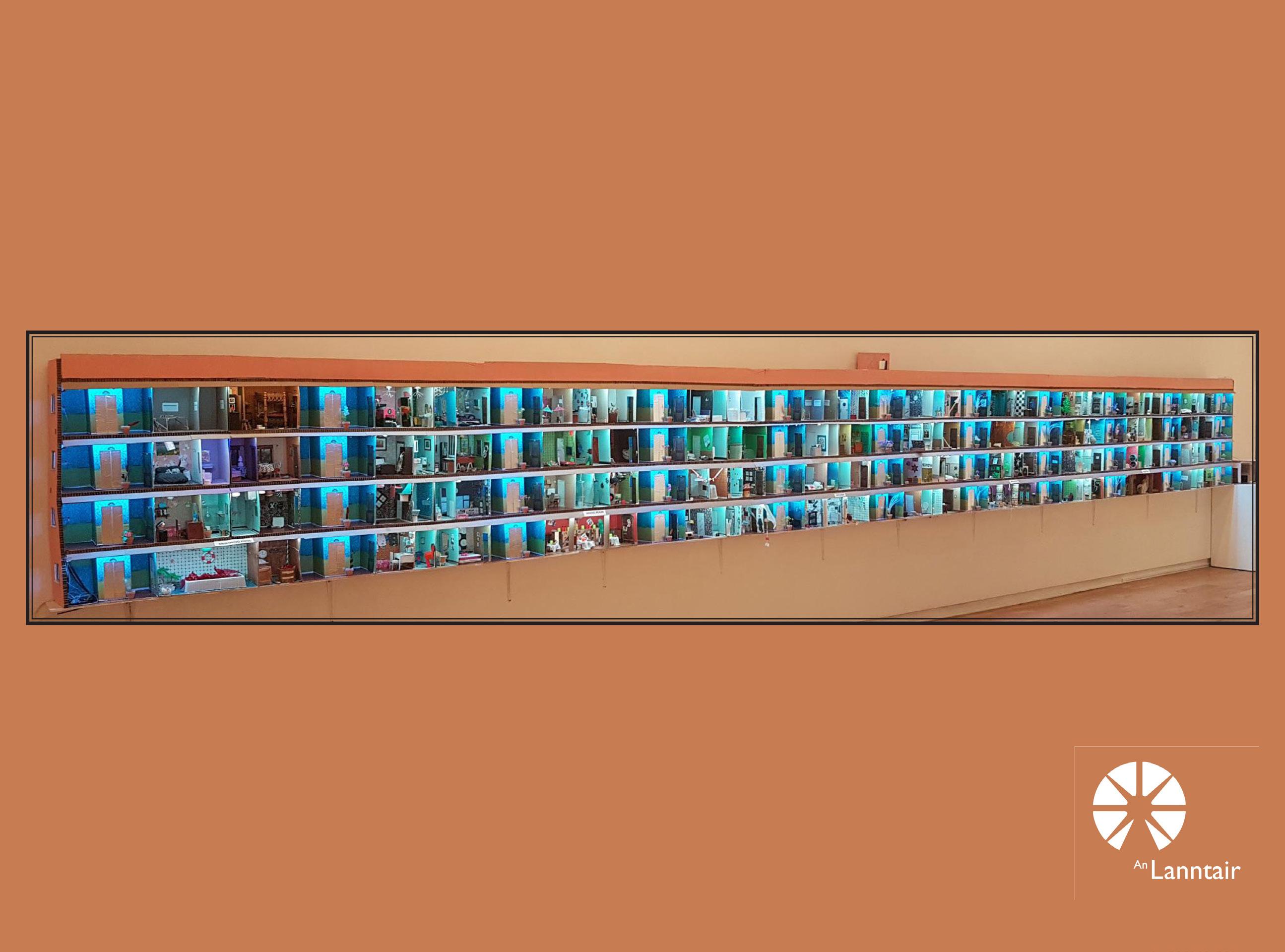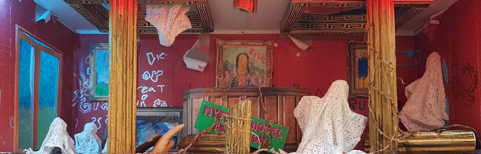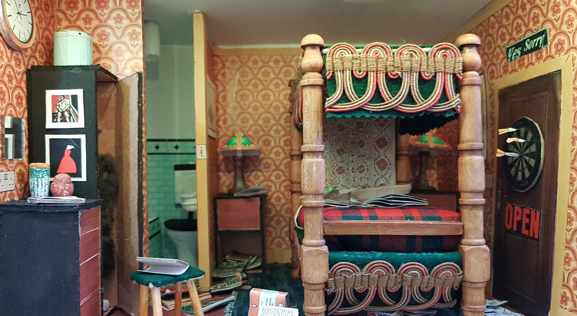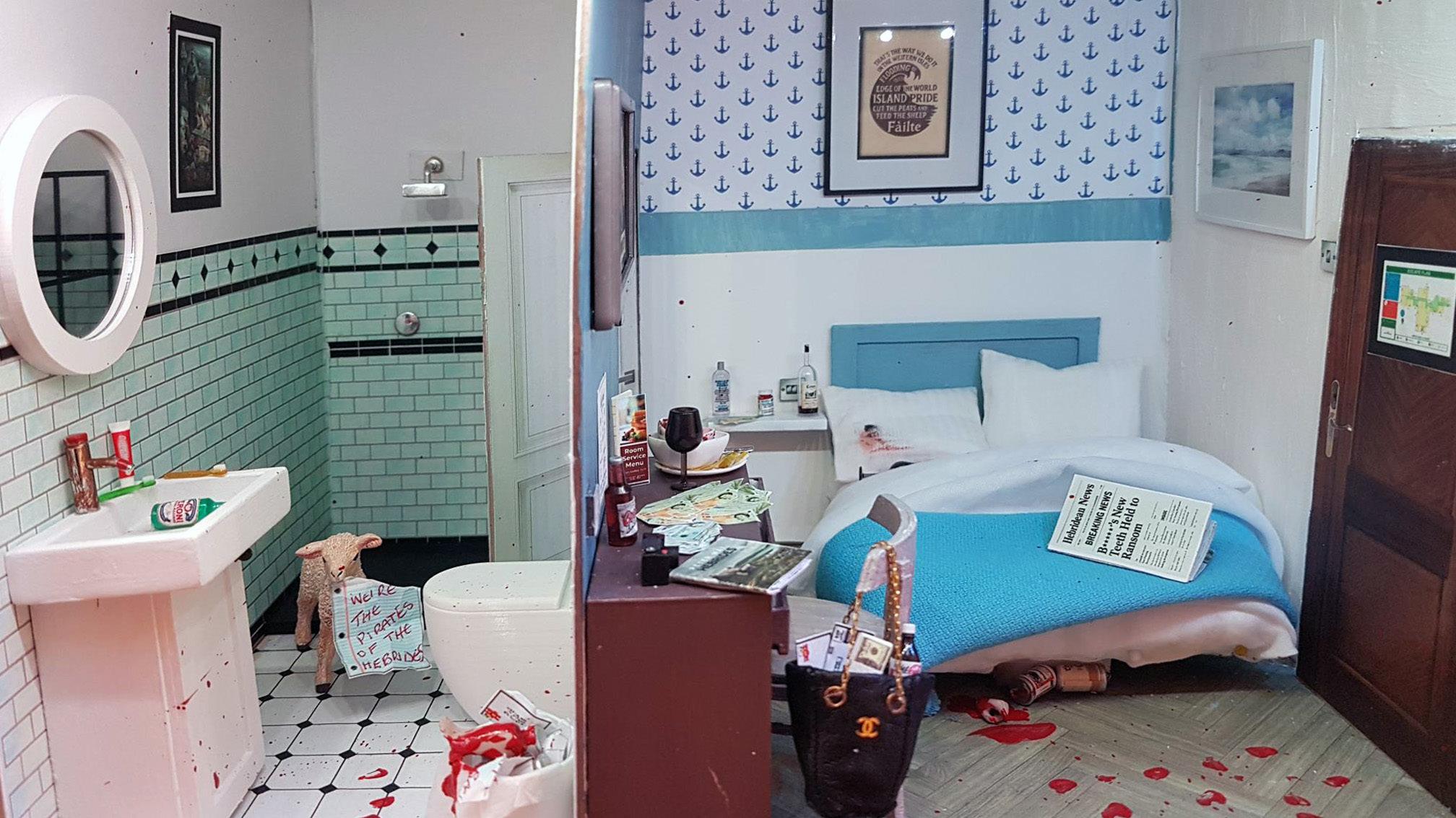 In December 2025 An Lanntair hosted an exhibition by Tom Hickman called ‘Dolls Houses and the Art of the Miniaturist ‘. Linked to this exhibition An Lanntair initiated the An Lanntair Mystery Hotel project to engage people in the run up to the exhibition. An Lanntair created ‘flat pack’ hotel rooms complete with printed resources including, wallpaper, power points, signs, windows and much more. A general call out was made to members of the public to come and collect a room, take it home and construct and decorate it. When completed they were to bring it back to An Lanntair to become part of the An Lanntair Mystery Hotel which featured in the exhibition. The only guideline that they had to follow was to decide on some mystery / story that had taken place in the room and design the room accordingly.