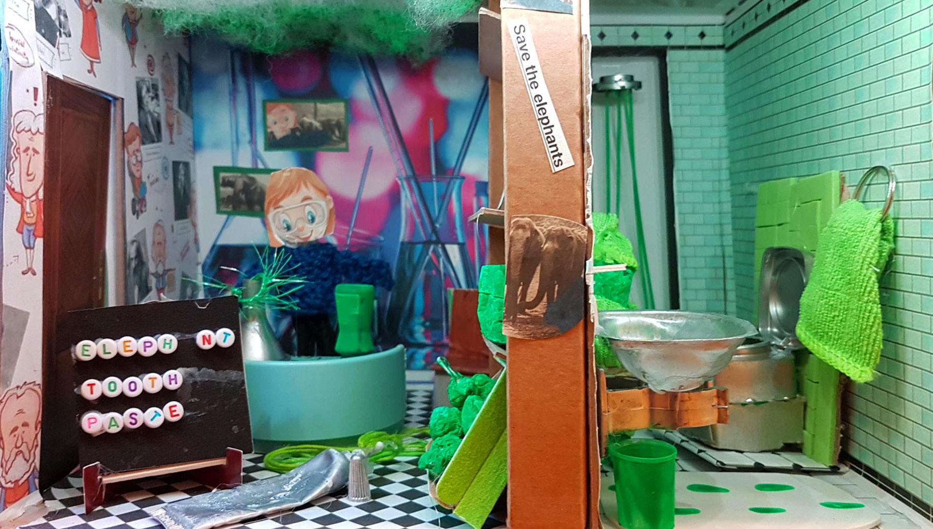 She checked into room 208 and began setting up her experiment. An ambition she’d had since working at the Elephant Sanctuary last Summer. There she was part of the ‘feeding’ team and as she lovingly fed the elephants their apples she realised the awful truth –elephants had very bad breath! She worked tirelessly to perfect her elephant toothpaste. Unfortunatly the experiment went badly wrong and as she rinsed out her containers, the water turned GREEN, bright green. Bad timing for her brother who had just showered.