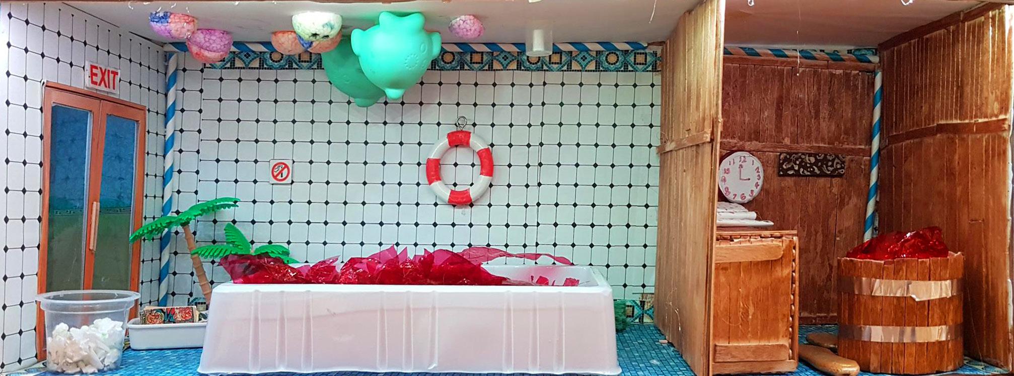 Strolling into the room with her trolley, the cleaner started swooshing her brush. To her surprise she glanced at the pool and saw that the water was pink. As she gazed up at the ceiling, she was shocked to see the floaties stuck to the ceiling. As she looked over her shoulder, had noticed a burst pipe dripping down from the basement pipes with pink water. Suddenly she heard bubbling and sizzling from the hot tub room. She raced there and smelt acid eating the bubbles. She thought to herself, “the hot tub water must be a darker colour because it’s a smaller room.” As she stared down at the floor there were golden stepping stones. As she walked to the other room, she wondered why there was acid coming from the burst pipes. She decided to go investigate and went over to the burst pipes and grabbed a bottle to test what kind of acid it is. As she looked at it, she noticed it was one of the deadliest acids, but how did it make the pool pink?