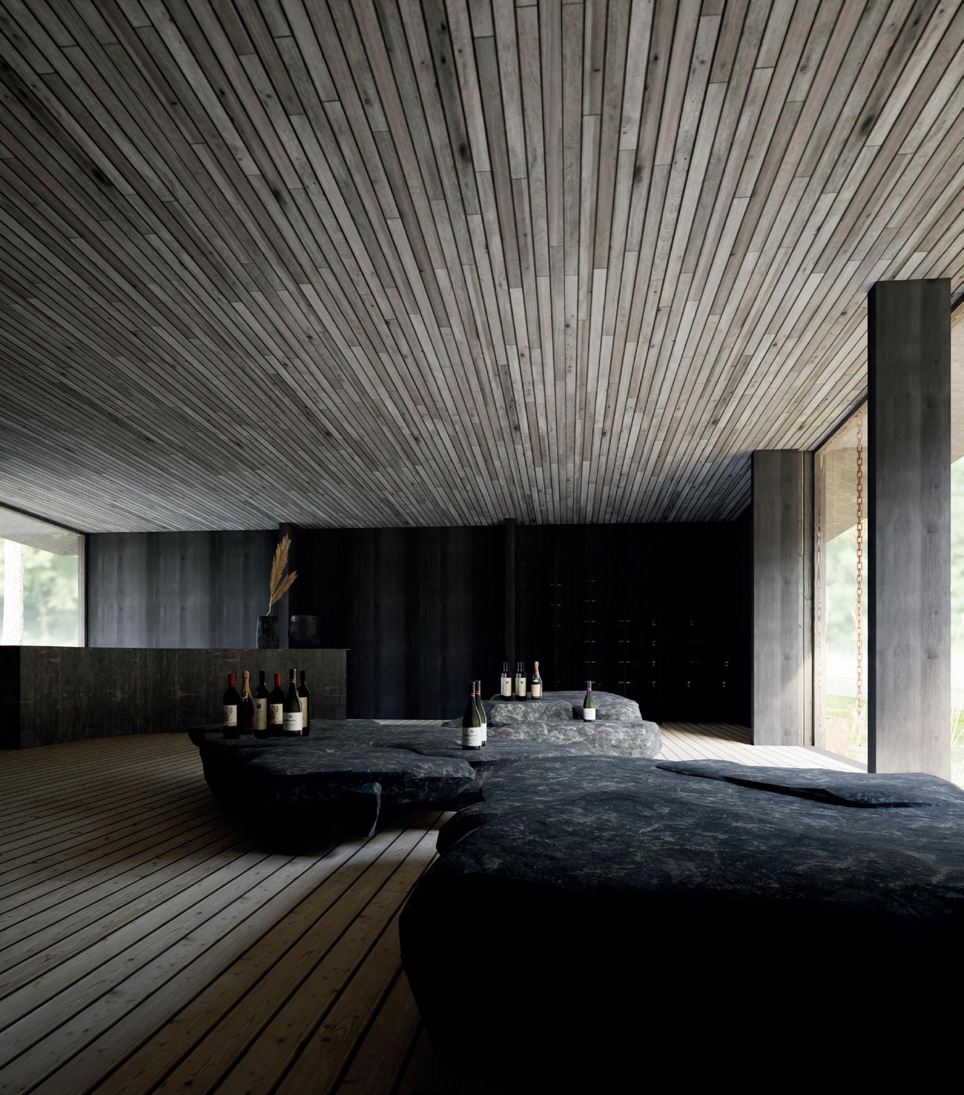 Cette section du vignoble, située dans le sud de l’Allemagne, est divisée en cinq zones : le jardin de pluie — le murmure de l’eau ; l’entrée — l’expérience de la dégustation ; le cœur du restaurant — une cuisine vivante et interactive ; la fin du repas dans le café-bar — une expérience festive et intime ; et la boutique et ateliers participatifs — un espace dédié à la découverte. Ces cœurs sont caractérisés par une enveloppe translucide chaleureuse ou par des murs ajourés en lattes de bois, intensifiant le sentiment d’intimité ou d’ouverture et offrant des espaces intérieurs et semi-extérieurs autour desquels l’usager se trouve en constante interaction avec l’eau et son environnement.