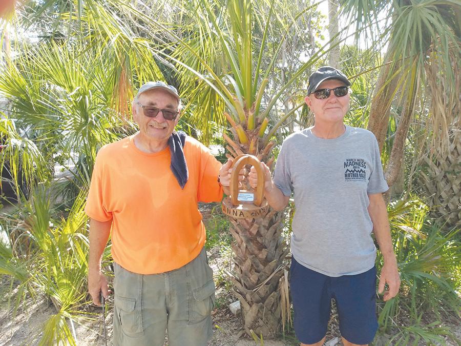 Tom Farrington, left, teamed up with Gary Howcroft on July 30 and they ended up in the winner's circle after posting the only 3-0 record during pool play at Anna Maria Horseshoes. On Aug. 2, two teams squared off in the final after each went 3-0. Farrington and Tim Sofran jumped out to an early lead and cruised to a 22-9 victory over Bob Hawks and Dom Livedoti to win the day’s competition