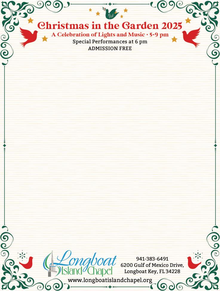 Christmas in the Garden, “A Celebration of Lights & Music,” through Dec. 31 with special musical presentations and refreshments on Dec. 4, Dec. 9, Dec. 11, Dec. 15, Dec. 16, Dec. 19 and Dec. 22 at 6 p.m. and a New Year’s Eve celebration on Dec. 31 from 4:306:30 p.m. featuring appetizers and a musical performance by John Rinell. Longboat Island Chapel, 6200 Gulf of Mexico Drive, Longboat Key, 5-9 p.m., free.