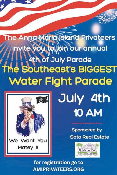 The Anna Maria Island Privateers are accepting applications to participate in their annual Fourth of July “water fight” parade. The parade departs from the Captain Scott Moore Boat Ramp in Bradenton Beach on Friday, July 4 at 10 a.m., travels through Holmes Beach and ends at Bayfront Park in Anna Maria. The registration fee is $25 and Wednesday, July 2, is the final day to register and pay the registration fee. The registration form and additional information is available at www.annamariaislandprivateers.org.