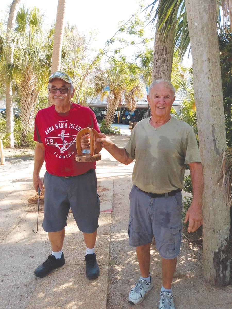 Tom Farrington, left, teamed up with Tim Sofran on June 21 and posted the only 3-0 record to win the day’s competition at Anna Maria Horseshoes. On June 18, Sofran won the day’s bragging rights after winning the final 21-16 over Farrington and Bob Heiger.