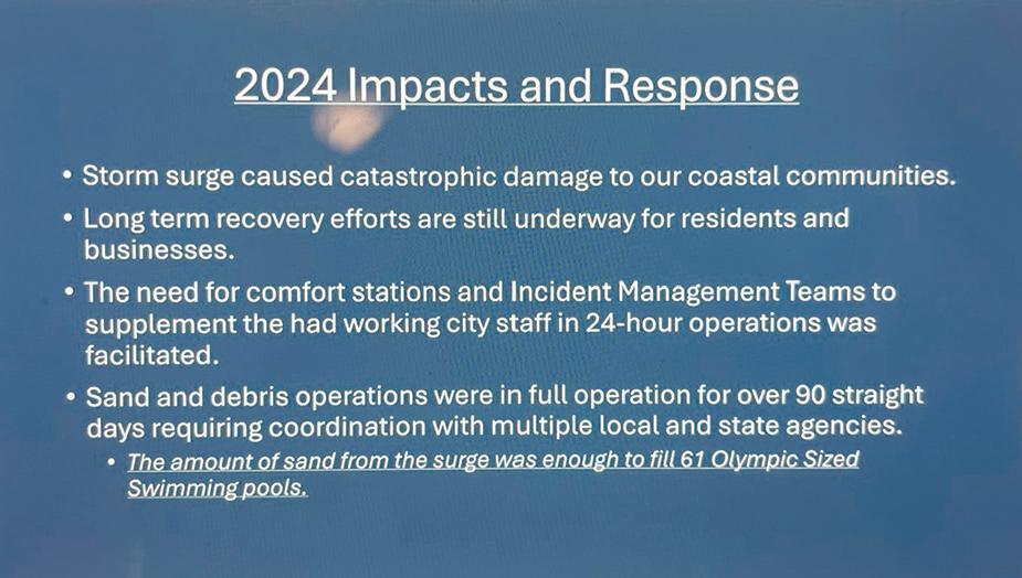 “I say all that because in 2024, the storm season really provided some invaluable but challenging lessons for public safety,” Crutchfield said. “Recovery is still ongoing for many of our residents and businesses. We ran sand debris operations for 90 days straight out on the Island and the storm surge provided enough sand to us to fill the equivalent of 61 Olympic swimming pools.”