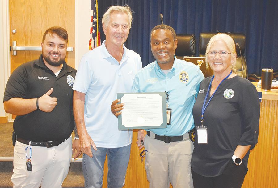City Commission Chair Dan Diggins proclaimed June 2-6 as Code Enforcement Officers’ Appreciation Week in Holmes Beach. With Code Compliance Chief James “J.T.” Thomas and code compliance officers Sandy Olsen and Jason Clayton present at the May 27 commission meeting, Diggins read aloud a proclamation that said, “Code enforcement officers are vital to the safety, health and welfare of our community, diligently enforcing building, zoning, housing and other codes and ordinances. These officers play a critical role in improving neighborhoods, enhancing quality of life and ensuring property values remain stable, Their work is often behind the scenes, yet essential for maintaining a thriving and compliant community. The Florida Association of Code Enforcement annually recognizes the importance of code enforcement officers and has declared the first week of June to be set aside by local governments to honor and recognize their code enforcement officers.” When addressing the commission, Thomas said he and the code compliance staff appreciated the proclamation and the recognition. He introduced code compliance officers Sandy Olsen and Jason Clayton and recognized and thanked code compliance officer Nate Brown for his 10 years of ongoing service. The code compliance department oversees the city’s vacation rental certificate program and currently regulates 1,600 vacation rentals. Thomas and his officers assist the building and planning departments, help enforce the city’s building codes, help manage the trash accumulation at beach access points and help protect sea turtles and other wildlife.