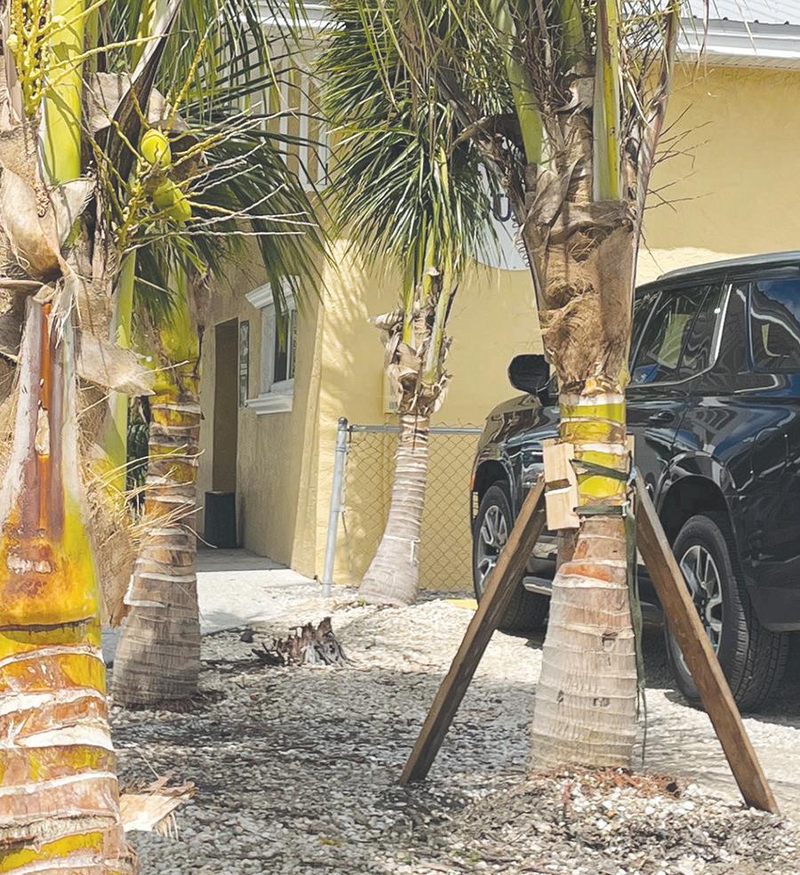 These stakes that Bradenton Beach city workers installed on June 17 to support a large coconut palm tree on Bridge Street that had fallen over the night before were laying on the ground on June 23. Mayor John Chappie told The Sun on June 17 that the tree had been staked before it fell, but the stakes kept disappearing.