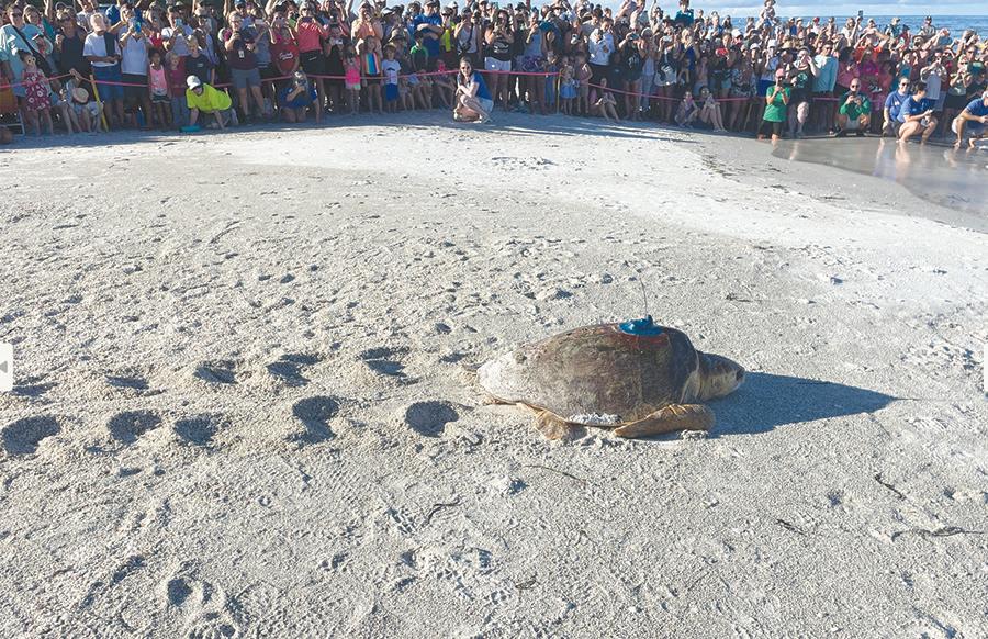 BRADENTON BEACH – To the delight of hundreds of spectators at Coquina Beach on Monday morning for a publicized turtle release, loggerhead sea turtle Henrietta stopped several times as she made her way down the sand toward the water.