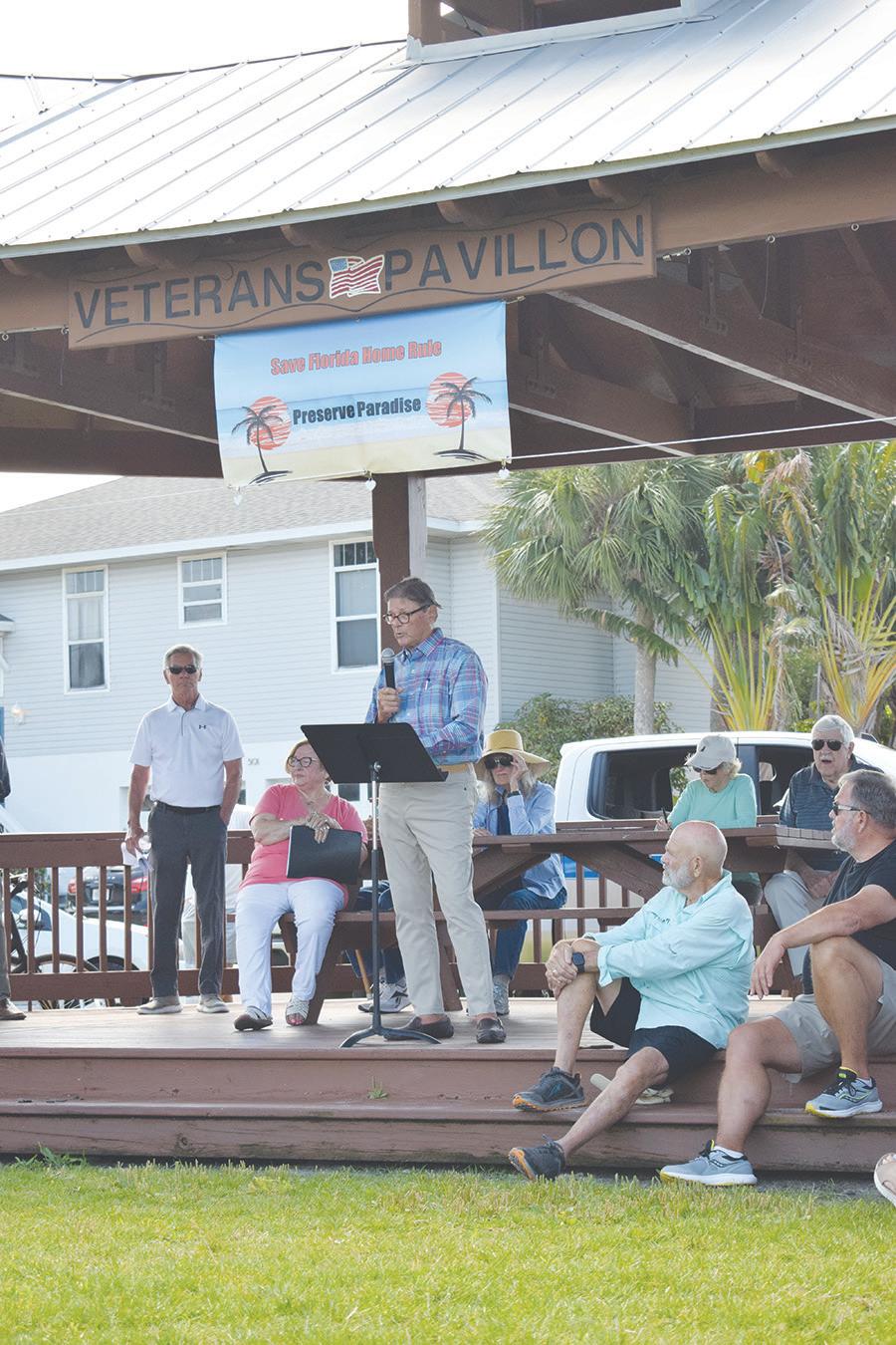 The rally, held on May 4 by the Save Florida Home Rule grassroots activist group, brought hundreds of people to the pavilion, including residents, visitors, property owners and other interested community members. Even Manatee County political satirical figure Kevin-Kyle Kaczynski Von Oswald made an appearance to cheer the group on, carrying a sign that said, “Save Home Rule.” It was a sentiment echoed by all in attendance as Island elected officials, residents, city staff and a county commission candidate took the stage to share facts with the community on both issues and speak out
