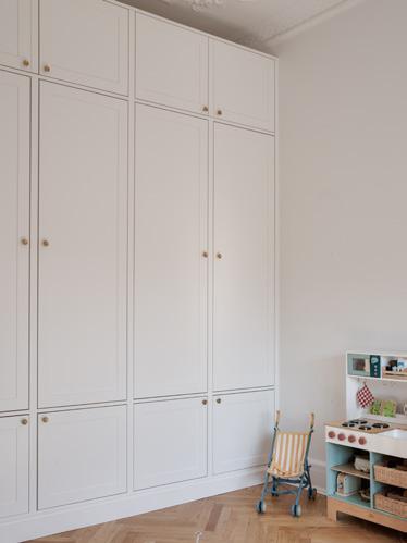 Ved siden af entréen ligger dette lyse og store værelse klar til at indrettes lige præcis til jeres behov og ønsker. I rummet finder I elegante garderober fra Handcrafted Interior, der naturligt smelter ind i lejlighedens oprindelige stil.