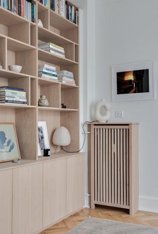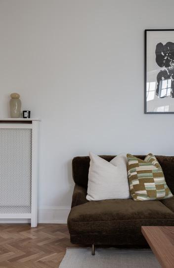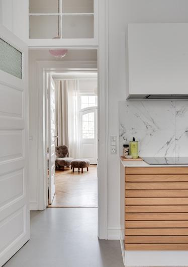 Ihjemmets køkken møder skandinavisk minimalisme de herskabelige rammer. Det gennemtænkte køkken fra Svanekøkken, tilføjer varme med den omsluttende layout, og med sine låger i træ. Armaturet og vasken i messing er et raffineret indslag, mens de mange skabe giver masser af opbevaringsmuligheder. I køkkenet kan I også nyde ægte hverdagshygge rundt om spisebordet, mens I kigger ud til den private altan.