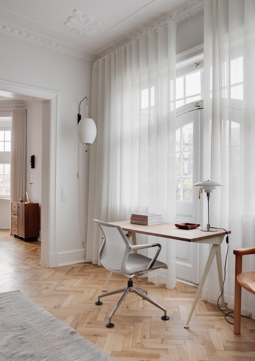 Hjemmekontoret forbinder stuen med spisestuen, men har alligevel sin egen ro og stemning. Det er en behagelig arbejdsplads hvor du føler dig inspireret, og hvor pauserne kan nydes med udsigt gennem det store vindue med dør ud til en fransk altan. Her står også en flot indbygget reol i eg, der går fra gulv til loft, og som rummer både bøger og minder.
