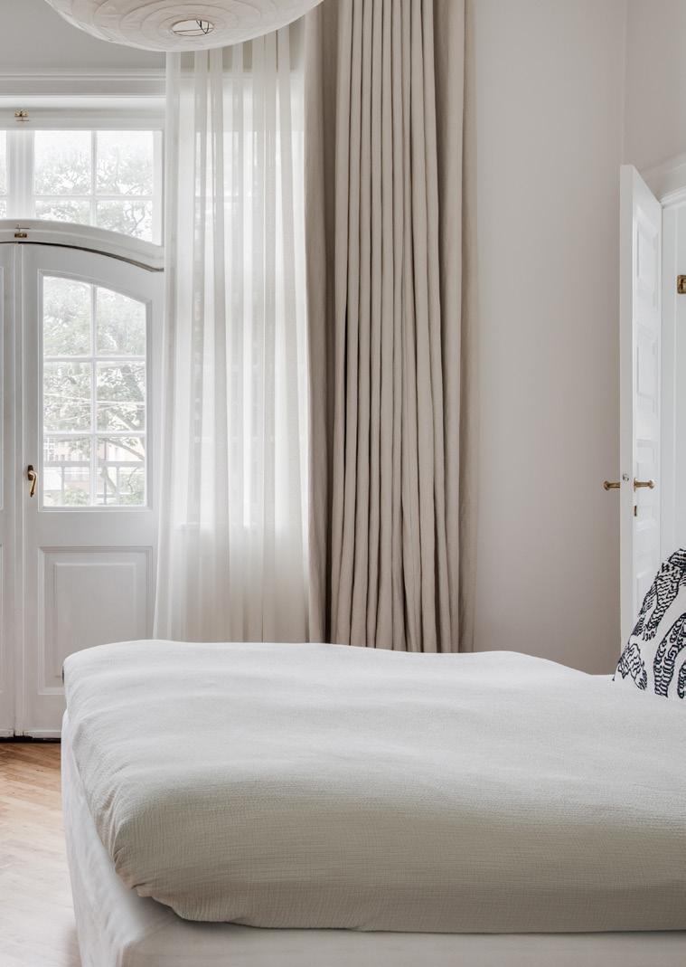 I det højloftede mastersoveværelse mødes du af en harmonisk stemning hvor smukke gardiner blødt indrammer det fine vindue og døren ud til den franske altan. Rummet føles både elegant og roligt, og gennem en diskret dør venter det luksuriøse påklædningsværelse.