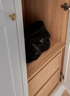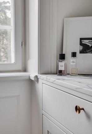 Det skræddersyede påklædningsværelse er indrettet fra top til tå, med skabe fra Handcrafted Interior. Her har hver ting sin plads og det smagfulde valg af marmor, messing og lysegrå toner, emmer af eksklusivitet.