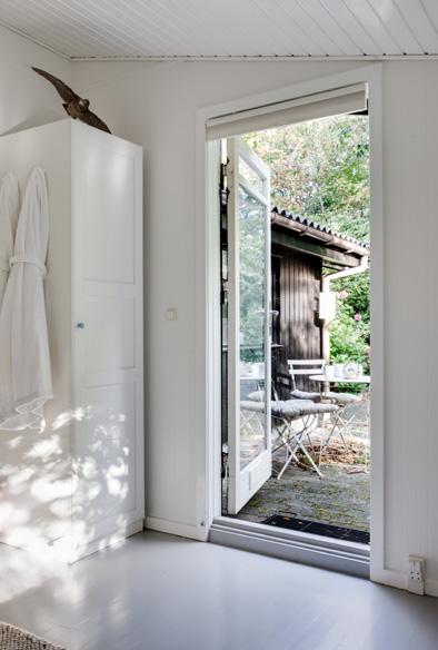 Et behageligt soveværelse med egen udgang til haven, og en lille terrasse på bagsiden af huset. Her hænger badekåberne altid fremme, hvis du får lyst til et morgendyp i havet.