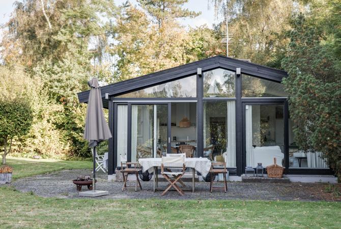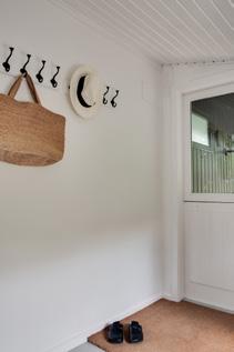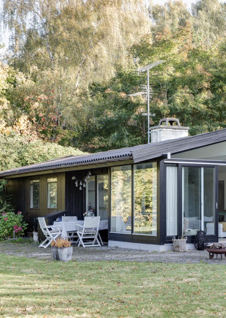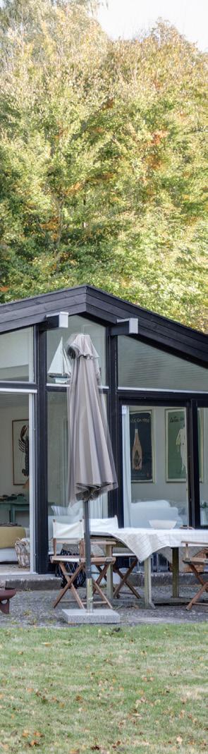 Drej ind til den næsten skjulte carport, luk bildøren, tag en dyb indånding, sommeren kan starte. Nr. 18 ligger ugeneret placeret bag buskads og høje træer. En sti langs med husets sorte facade fører dig til indgangen og den store entré.