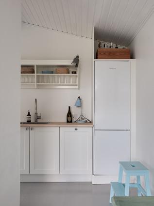 KØKKENET er ikke bare nyt og funktionelt, det smelter også smukt ind i den åbne stue med sine hvide shaker fronter og lyse bordplade i træ. Den skandinaviske og landlig stil er et stilsikkert valg til denne sommerhusdrøm. Tænk Nordsjælland møder The Hamptons!