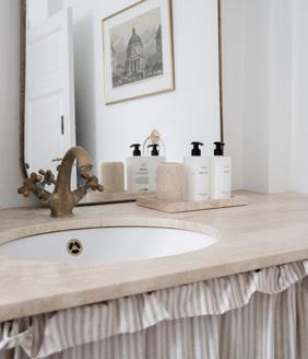 Badeværelset udmærker sig med en luksuriøs og stilren æstetik med indslag af klassiske detaljer. Her kan du lade roen sænke sig i badekaret på løvefødder, eller nyde et forfriskende brusebad under den flotte bruser i messing. Gulv og vægge er beklædt med smuk beige natursten, der fuldender rummets harmoniske og eksklusive udtryk.
