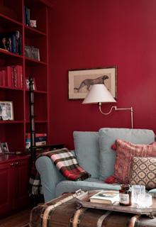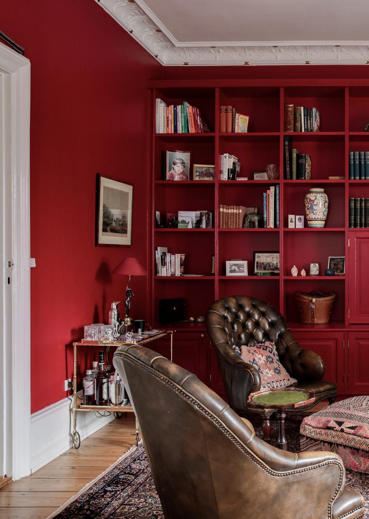 Kontoret og biblioteket deler samme magiske udsigt som i stuen. Her kan du dagligt lade øjnene hvile på Marmorkirkens opulente detaljer. Både væggene og den specialbygget bogreol, er malet i en dramatisk rød farve. En farve der perfekt matcher den grønne kuppel, og de historiske rammer. Her findes også god plads til den overnattende gæst.
