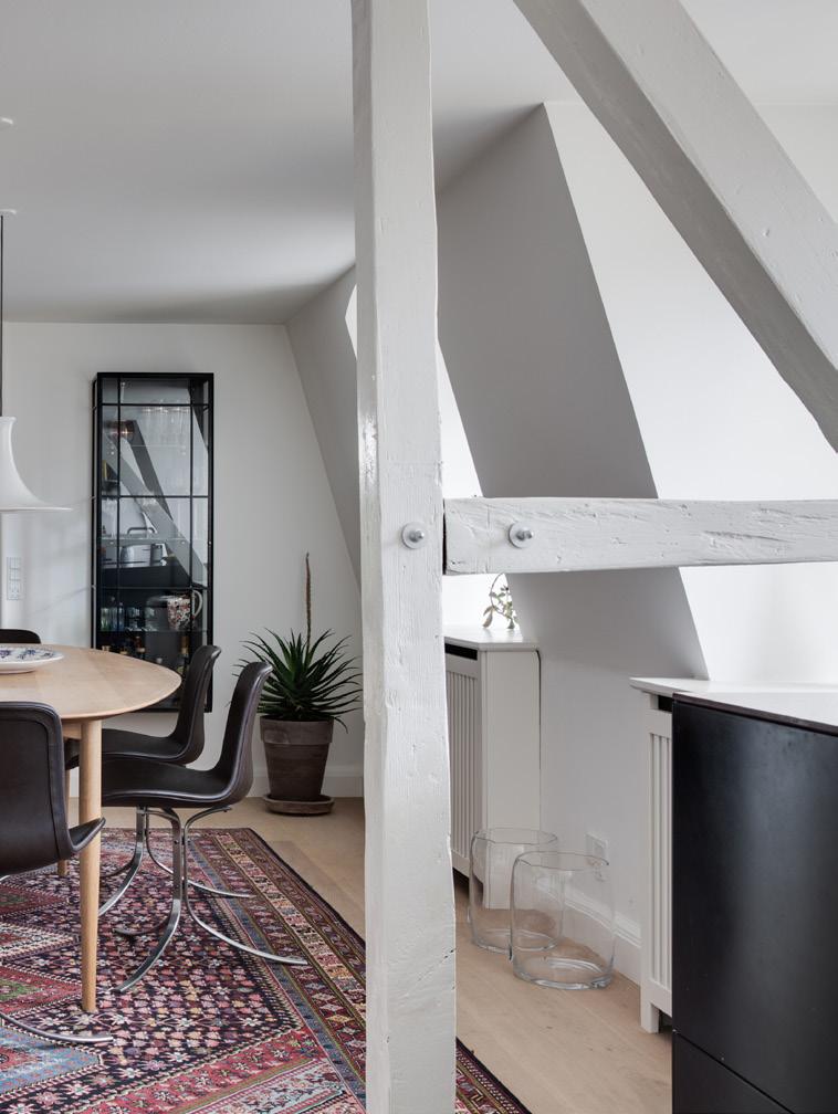 Hjemmets spisestue byder på varm atmosfære fyldt med charmerende detaljer som hyggelige kvistvinduer, en dejlig pejs, og synlige hvide bjælker. Fra de fire vinduer kommer der ind et naturligt lysindfald, og du har en udsigt over ejendommens baggård og byens hustage.