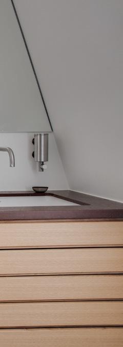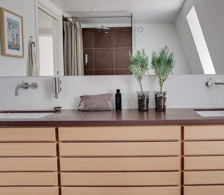 Det har fået samme mørkerøde Ølandskalksten som i køkkenet, og det pryder både vask, gulv og væg. Armaturerne er fra Vola, og i det brede vaskeskab i varmt træ fra Multiform, er der masser med plads til skønhedsprodukter og håndklæder.