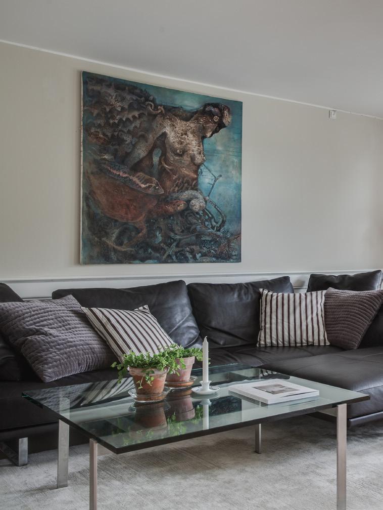 I det åbne køkken fortsætter den sociale og varme stemning fra spisestuen. Det elegante køkken fra Multiform komplementeres med den smukkeste bordplade i Ølandskalksten, og eksklusive topmodel hvidevarer fra Gaggenau. Fra køkkenet leder en gang med indbyggede gulv til loft skabe, helt ned til soveværelset.