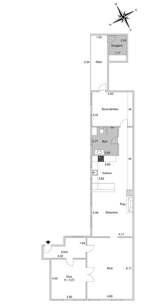 Vel inde fortætter hyggen i en fin entré med plankegulve, skråtag og et vindue der vender ud til gården. Herfra har du indgang til hjemmets to stuer.