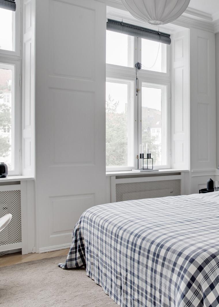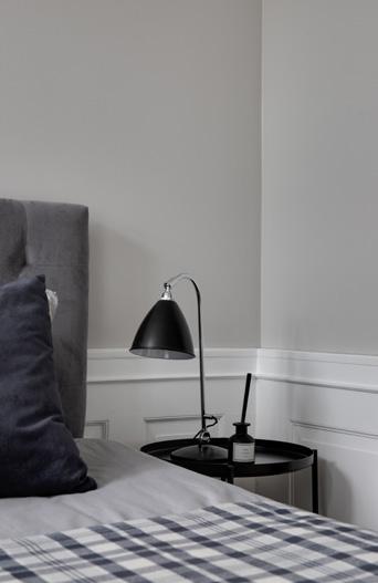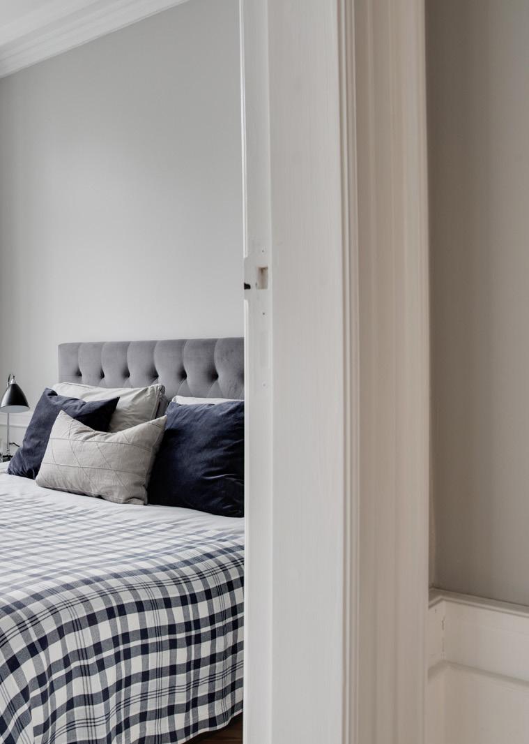 Et behageligt og smukt soveværelse der ville passe på et femstjernet hotel. Væggen ud mod gaden er klædt helt i originale vægpaneler, og under vinduerne, findes der fine radiatorskjulere. Som prikken over i’et, har værelset en walk-in garderobe, med elegante mørkegrå indbyggede skabe.