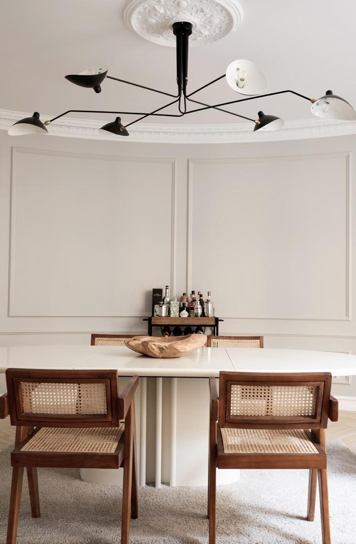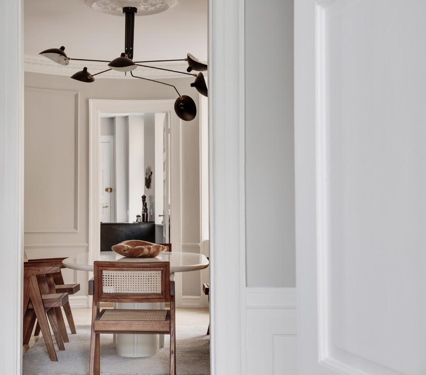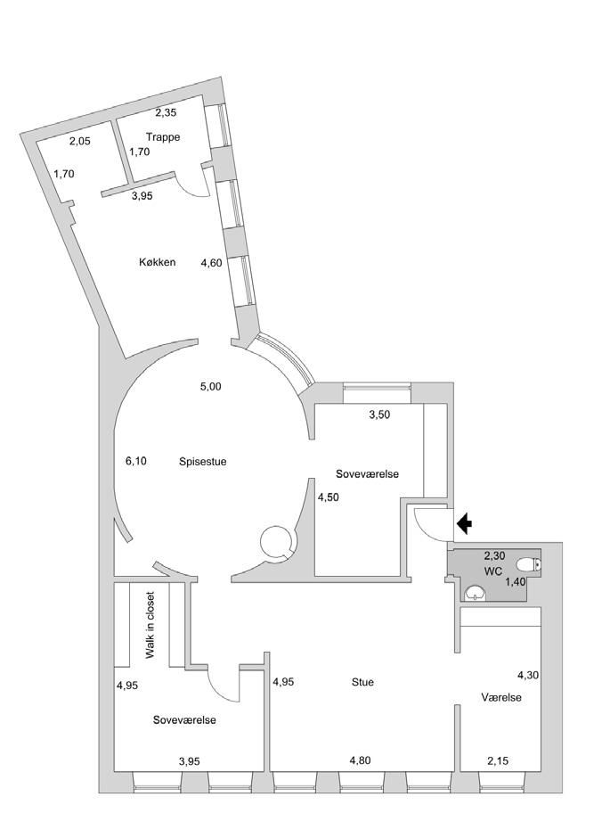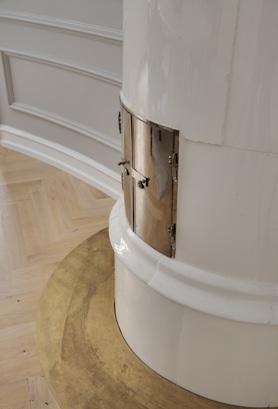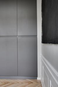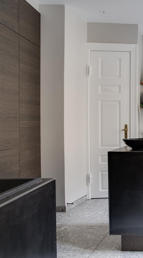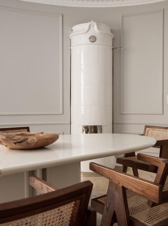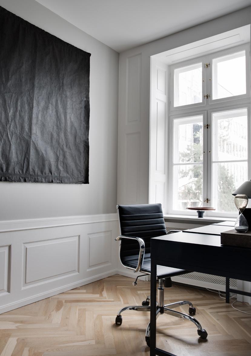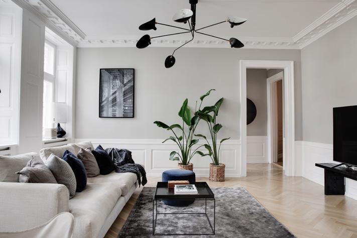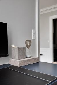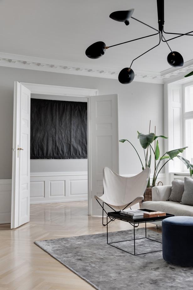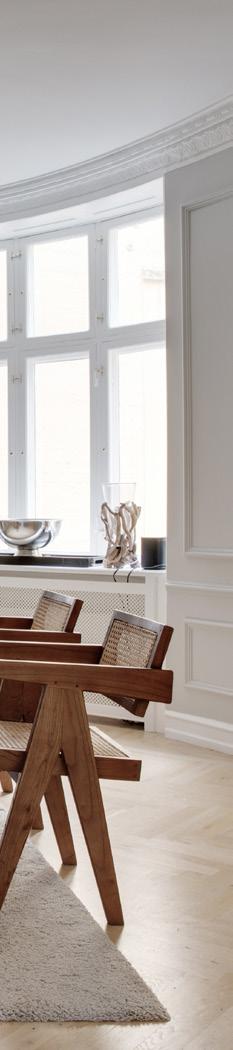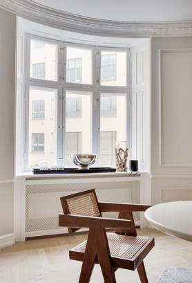 Det er et sikkert æstetisk formsprog, når maskuline materialer og farver, møder bløde feminine former. I denne lejlighed er dette koncept, fuldendt til perfektionisme. De 150 kvm og fem værelser er stilfuldt renoveret med fokus på høj kvalitet og sober æstetik. Her får herskabeligheden lov til at glimre, og de moderne indslag er smagfulde og nøje udvalgte. Lejlighedens lyse sildebensparket, de smukke snedkerdetaljer og den svenske kakkelovn, står skarpt imod væggenes matte grå/beige farve.