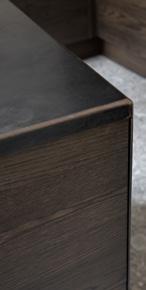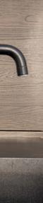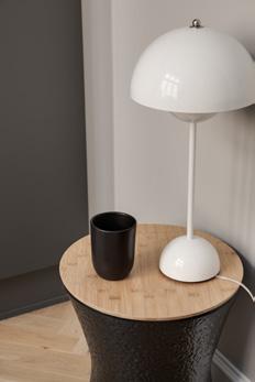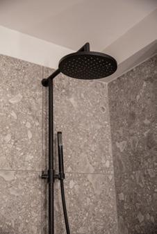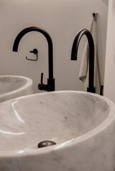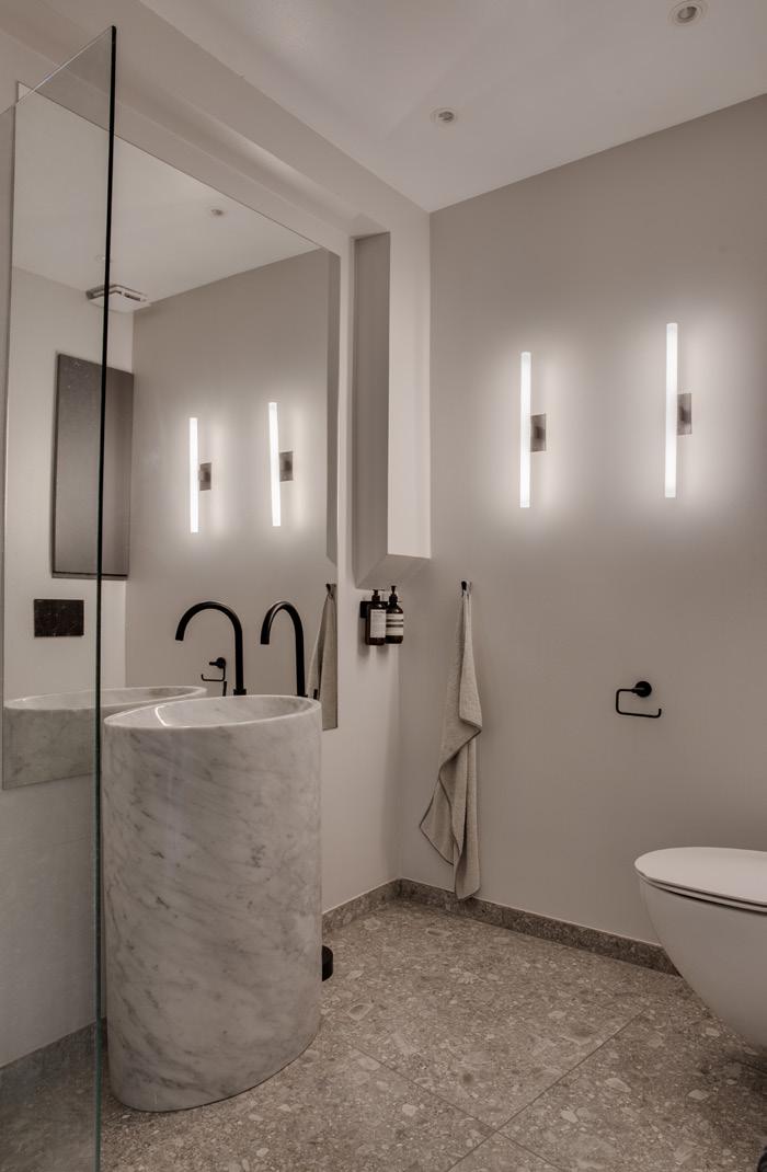 Ligesom køkkenets design, er badeværelserne blevet forkælede med de smukkeste materialer, indretning og farvevalg. Stilen er international og minimalistisk, med et hint af industriel luksus. Den ovale håndvask i marmor, de sorte armaturer, og de stemningsfulde lysrør på væggen, er med til at fuldende looket.