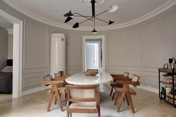 Lad dig imponere og inspirere i denne himmelske spisestue. Væggenes matte grå farve og dekorative lister, fremhæver den ovale form og den elegante stuk. Den buede form spejles i den stemningsfulde svenske kakkelovn og det store vindue. Selvfølgelig skal spisebordet også være ovalt!