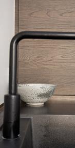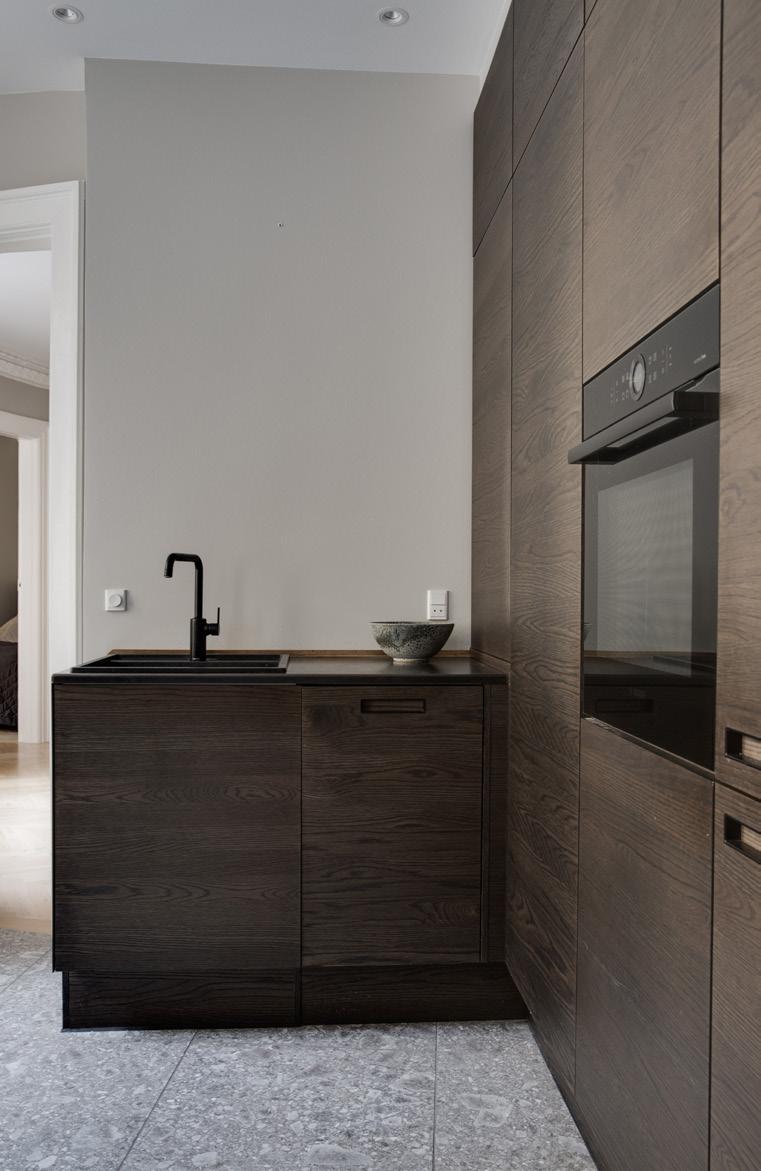 Det eksklusive Svane køkken er ikke kun utroligt stilfuldt, det udnytter desuden hver kvadratmeter på en meget intelligent måde. Det maskuline look og valg af materialer, komplementerer lejlighedens feminine udtryk. Her får du mørkebrune og grebsfrie trælåger, en rå stålbordplade og grå marmorfliser.