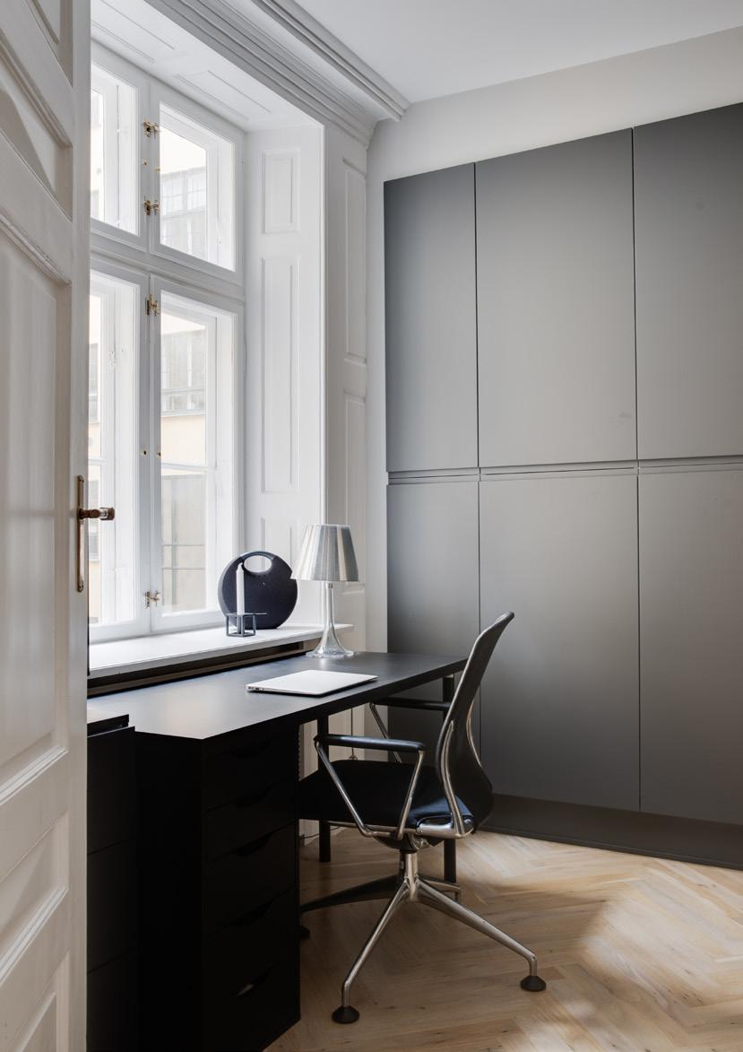 Kontorets store indbyggede skab, gør det nemt at bevare kontorets minimalistiske stil, hvilket giver dig ekstra dejlig arbejdsro.