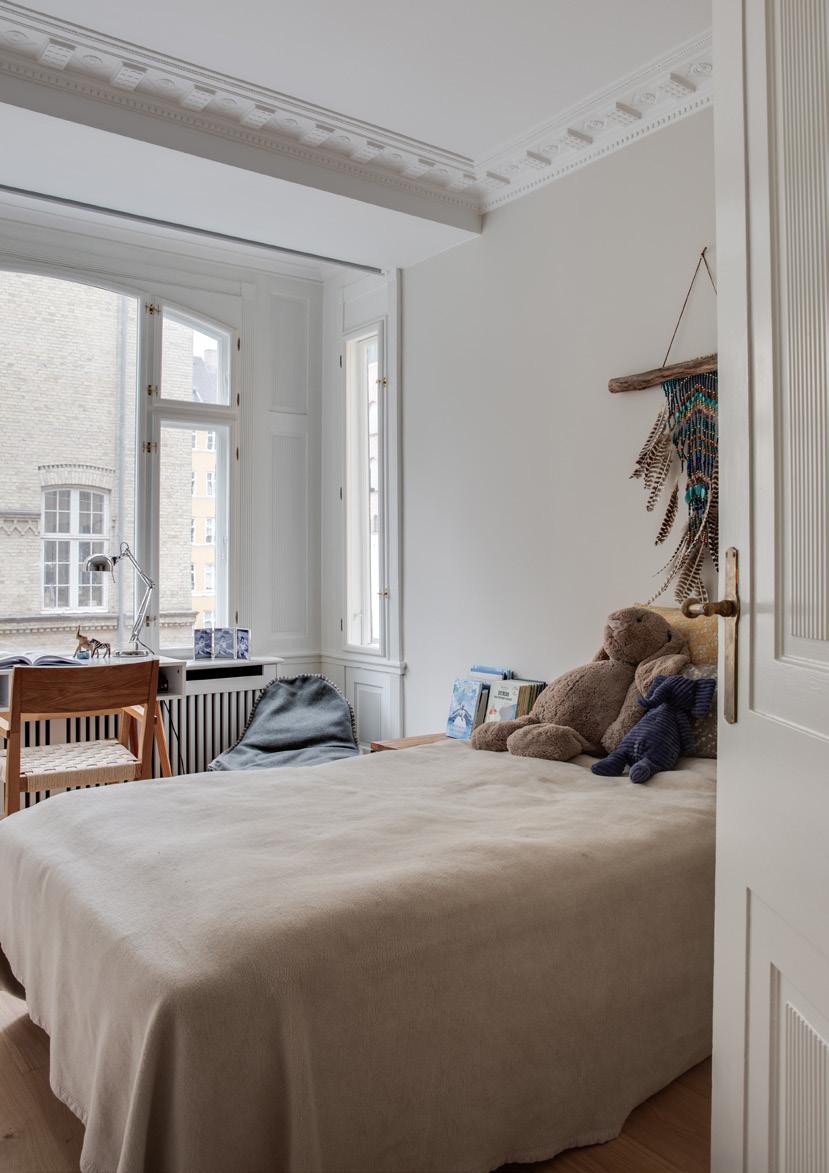 Dette lyse soveværelse charmerer med sin dejlige loftshøjde med stuk, og den fine karnap.