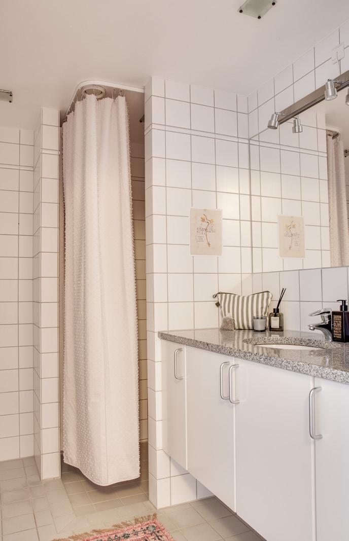 Badeværelset er indrettet i klassiske og tidsløse hvide fliser der går fra gulv til loft. Det brede vaskeskab gemmer på alt det nødvendige, og i et af hjørnerne er der gjort plads til vaskemaskine og tørretumbler. Brusenichen kan afskærmes med et pænt bruseforhæng, så resten af rummet forbliver tørt og rart. Her kan du starte hver morgen med en hurtig morgenrutine, eller afslutte dagen med et langt og varmt bad.
