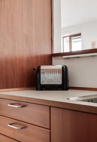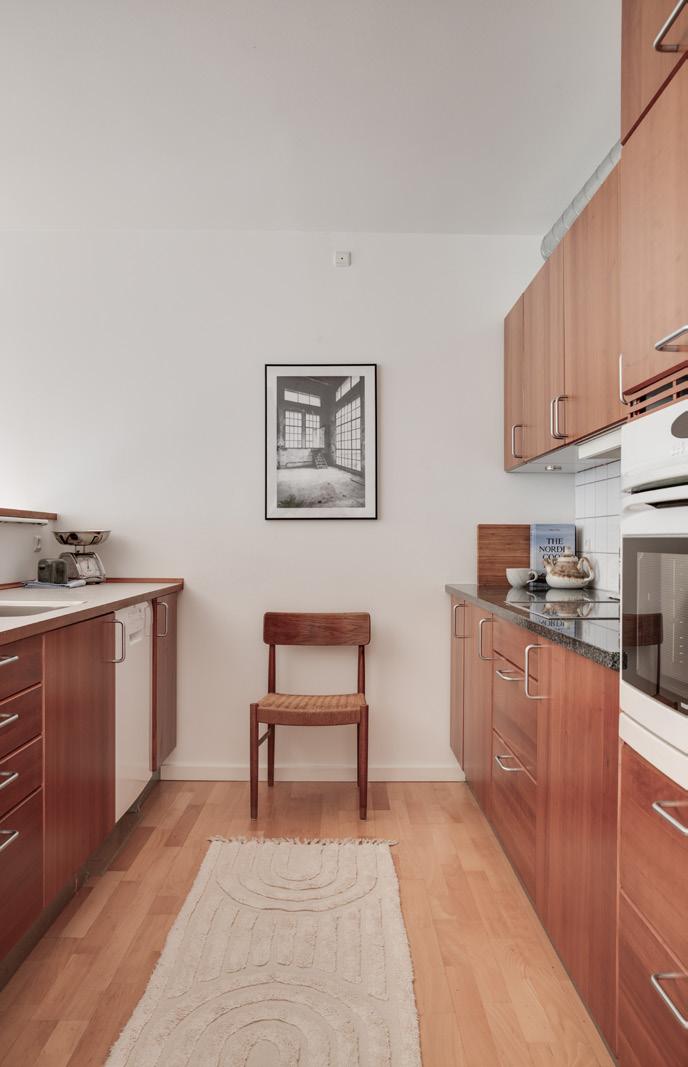 Lejlighedens hjerte er det åbne og venlige køkken/alrum, hvor lys og luft får lov til at fylde rummet fra de elegante vinduespartier i mørkt træ. Her er plads til både madlavning, samvær og afslapning – alt samlet i ét funktionelt og stilrent rum.
