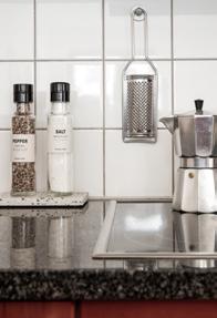 Køkkenet er ligeså hyggeligt som det er funktionelt. De mørke køkkenskabe og rene linjer, tilføjer en fin kontrast til resten af den lyse indretning. Opbevaringen er veludnyttet, og det åbne layout gør det let at være vært, mens man laver mad.