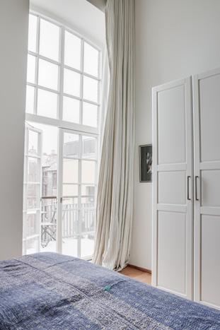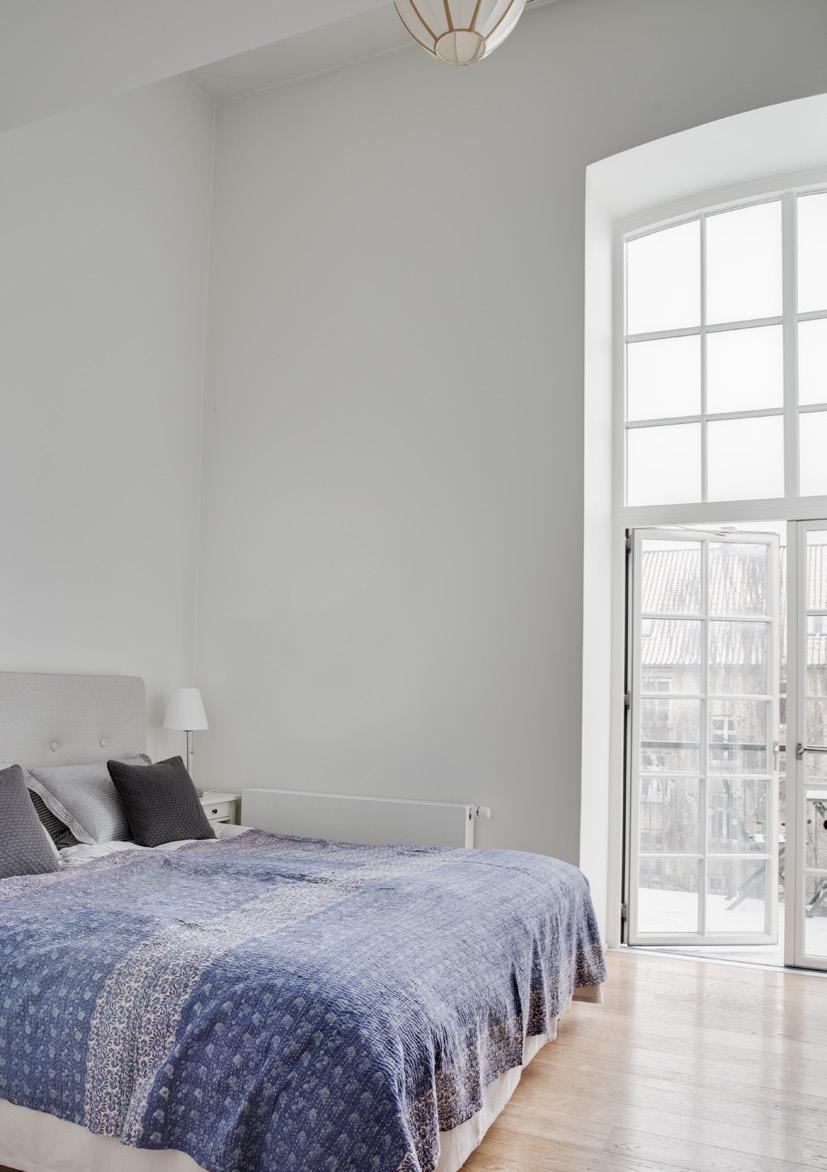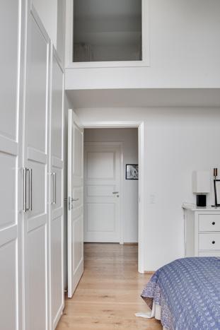 Mastersoveværelset er et lyst og indbydende rum med ligeså imponerende loftshøjde som i stuen. Her råder en særlig rummelig og eksklusiv atmosfære. Det store vinduesparti tilfører et smukt naturligt lysindfald og den leder direkte ud til terrassen, hvilket skaber en flydende overgang mellem inde- og uderum.